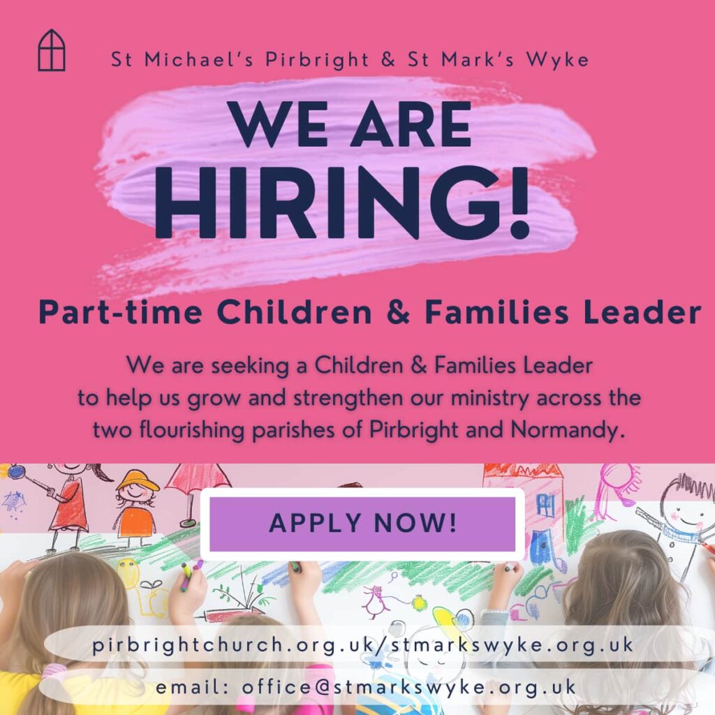We are seeking a Children and Families Leader to help us grow and strengthen our ministry across the two flourishing parishes of Pirbright and Normandy. This is a key appointment as we continue to build on the strong foundations already in place and move into an exciting next chapter in our ministry with children and families.